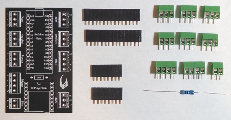 Includes the PCB, female headers, screw terminals, and 1k resistor. Arduino Nano, DFPlayer Mini, and other components are NOT included.